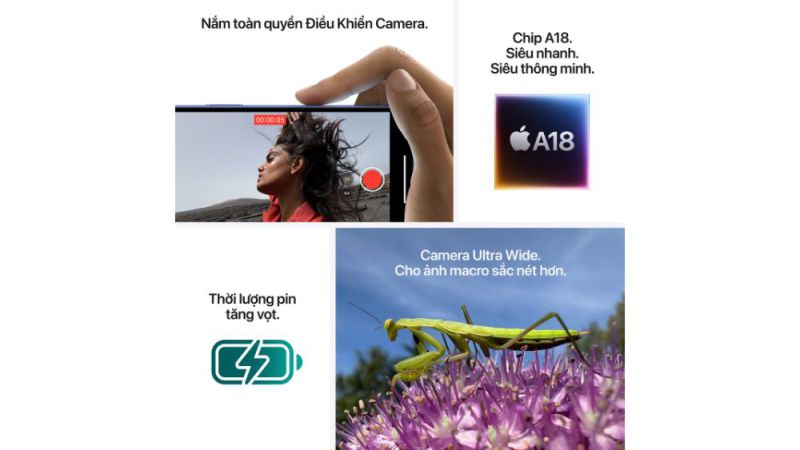 iPhone 16 có cụm camera được đặt theo chiều dọc thay vì đặt chéo như các thế hệ gần đây. Không chỉ thay đổi vị trí, khả năng chụp trên thiết bị này còn được cải tiến với camera chính 48MP, camera góc siêu rộng 12MP với chức năng tự động lấy nét và đặc biệt có hỗ trợ chụp ảnh macro. Người dùng nếu thường xuyên chụp các vật thể ở gần không cần phải lựa chọn các phiên bản Pro như ở các phiên bản tiền nhiệm. Cùng với đó, iPhone 16 còn có thể quay video với chế độ m Thanh Không Gian, giúp người xem có trải nghiệm nghe tốt hơn khi kết nối với AirPods, Apple Vision Pro hoặc hệ thống âm thanh vòm.