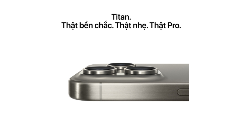 Không còn sử dụng khung nhôm, Apple thay thế bằng Titanium trên iPhone 15 Pro Max. Vật liệu sở hữu nhiều đặc tính về độ bền cũng khả năng tối ưu trọng lượng tuyệt vời. Thân máy dày hơn nhưng nhẹ hơn đáng kể so với iPhone 14 Pro Max.