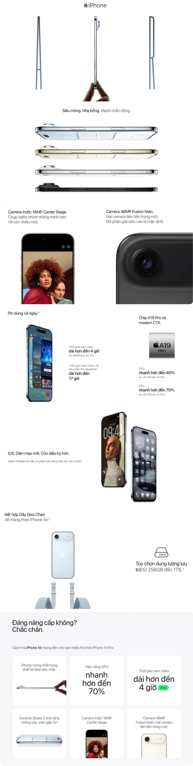 | Bộ vi xử lý | Apple A19 Pro ( CPU 6 lõi mới với 2 lõi hiệu năng và 4 lõi tiết kiệm điện ) |