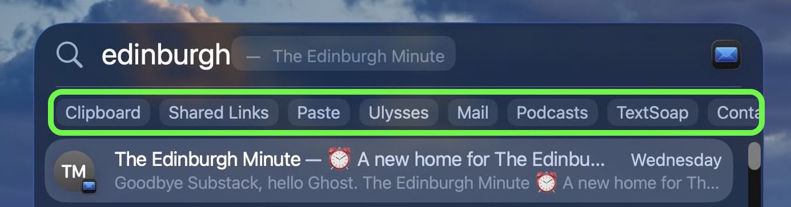 Khi Spotlight đang mở, bạn sẽ thấy 4 biểu tượng ở bên phải: Apps – Files – Actions – Clipboard. Có thể truy cập nhanh bằng: